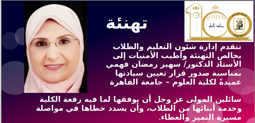 رئيس جامعة القاهرة يعلن صدور القرار الجمهوري بتعيين د.سهير رمضان فهمي عميدا لكلية العلوم لمدة ثلاث سنوات.